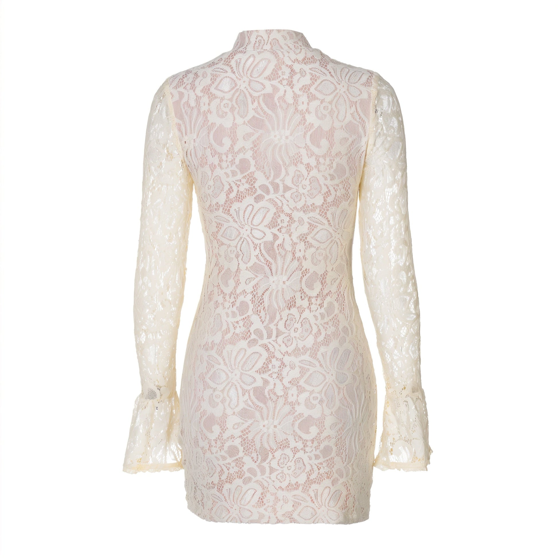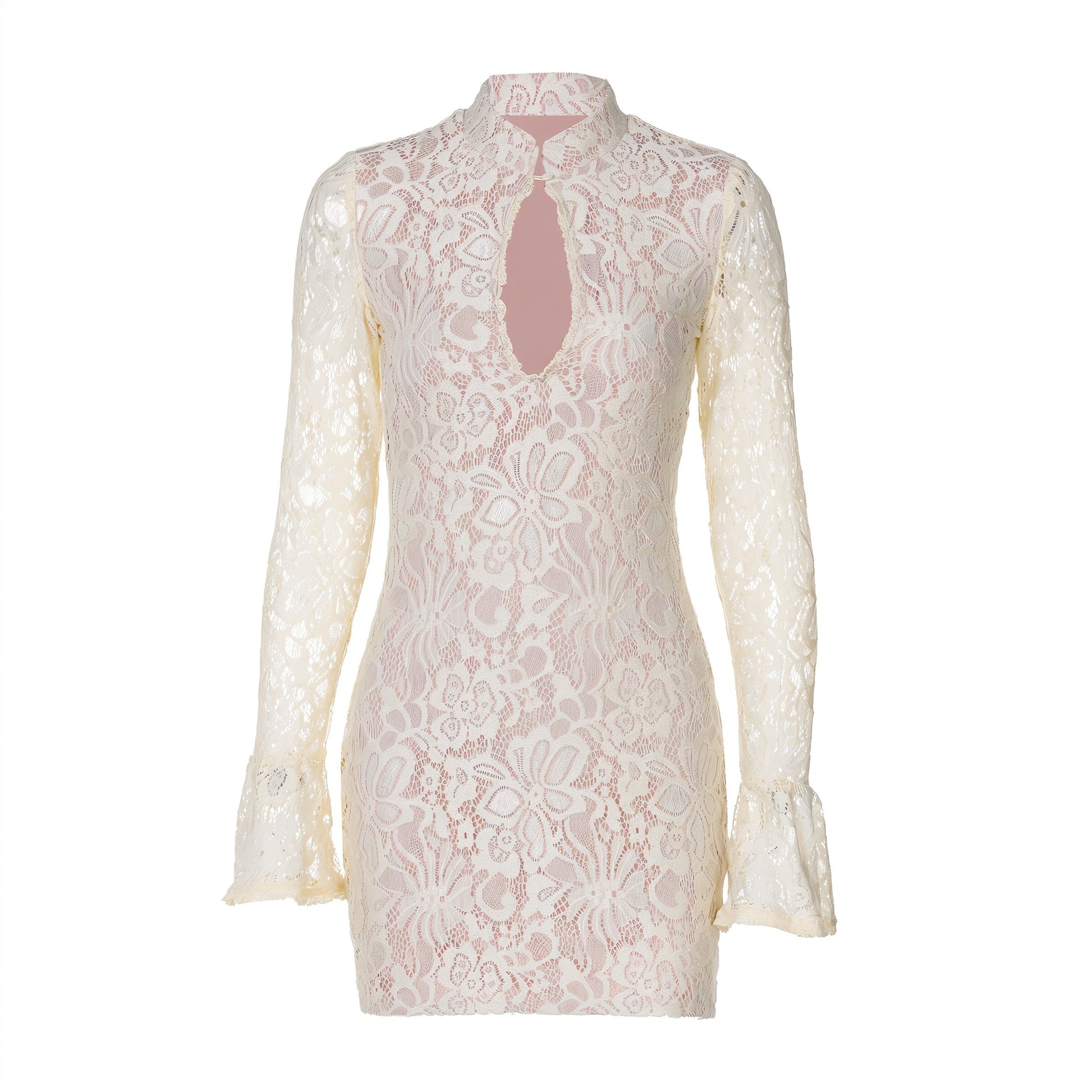 The Roisin dress is a stunning lace mini-dress featuring a delicate floral pattern. It has a form-fitting silhouette with long sleeves that flare at the cuffs, adding an elegant touch. The plunging keyhole neckline enhances its sultry appeal, while the soft light yellow color complements the intricate lace detailing.